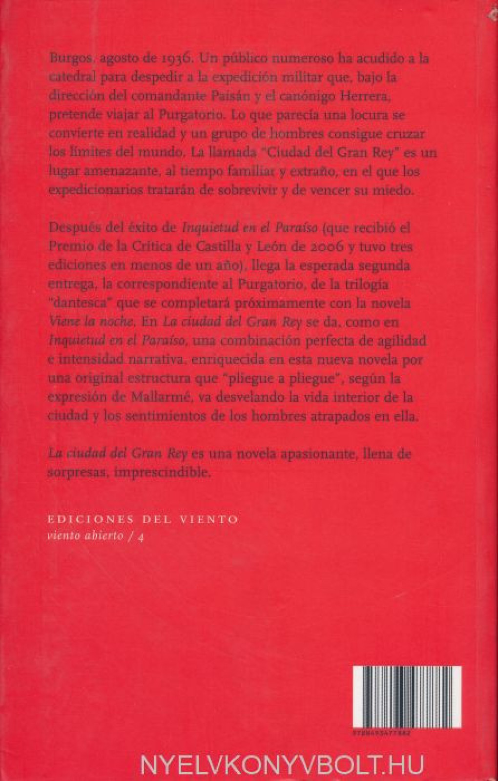 Lo que parecía una locura se convierte en realidad y un grupo de hombres consigue cruzar los límites del mundo. La llamada “Ciudad del Gran Rey” es un lugar amenazante, al tiempo familiar y extrano, en el que los expedicionarios tratarán de sobrevivir yde vencer su miedo. Después del éxito de "Inquietud en el Paraíso" (que recibió el Premio de la Crítica de Castilla y León de 2006 y tuvo tres ediciones en menos de un ano), llega la esperada segunda entrega, la correspondiente al Purgatorio, de la trilogía “dantesca” que se completará próximamente con la novela Viene la noche. En La ciudad del Gran Rey se da, como en "Inquietud en el Paraíso", una combinación perfecta de agilidad e intensidad narrativa, enriquecida en esta nueva novela por una original estructura que “pliegue a pliegue”, según la expresión de Mallarmé, va desvelando la vida interior de la ciudad y los sentimientos de los hombres atrapados en ella. "La ciudad del Gran Rey" es una novela apasionante, llena de sorpresas, imprescindible.
