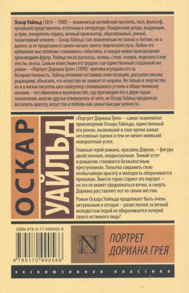 Portret Doriana Greja — samoe znamenitoe proizvedenie Oskara Uajlda, edinstvennyj ego roman, vyzvavshij v svoe vremja shkval negativnykh otsenok i tem ne menee imevshij neverojatnyj uspekh.Glavnyj geroj romana, krasavets Dorian, — figura dvojstvennaja, neodnoznachnaja. Tonkij estet i romantik stanovitsja bezzhalostnym prestupnikom. Popytka sokhranit svoju neobychajnuju krasotu i molodost oborachivaetsja provalom. Vmesto geroja stareet ego portret — no eto ne mozhet prodolzhatsja vechno, i smert Doriana rasstavljaet vse po svoim mestam.Roman Oskara Uajlda prodolzhaet byt ochen aktualnym i segodnja — razve pogonja za vechnoj molodostju poroj ne oborachivaetsja poterej svoego istinnogo litsa?