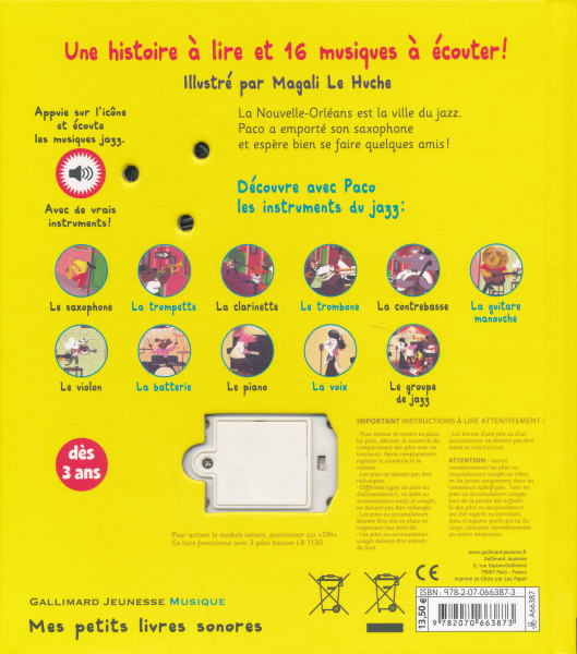 La Nouvelle-Orléans est la ville du jazz. Paco a emporté son saxophone et espere bien se faire quelques amis ! Au fil de l'histoire, on découvre les instruments du jazz : le saxophone, la trompette, la clarinette, le trombone, la contrebasse, la guitaremanouche, le violon, la batterie, le piano, la voix et, enfin, le groupe de jazz.