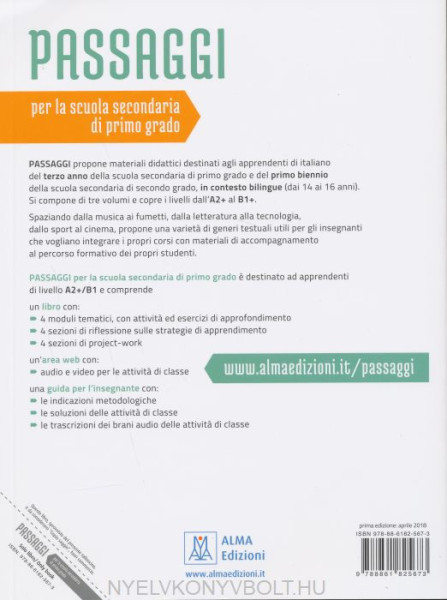 PASSAGGI nasce da un progetto di creazione di materiali didattici focalizzati sulla comprensione di testi autentici destinati agli apprendenti di italiano del terzo anno della scuola secondaria di primo grado e del primo biennio della scuola secondaria di secondo grado, in contesto bilingue (dai 14 a i 16 anni). E incentrato sulla dimensione testuale ed e orientato soprattutto allo sviluppo della competenza comunicativa, ma presta attenzione anche al potenziamento della collaborazione tra pari e alla riflessione sulle strategie di apprendimento. Propone una varieta di generi testuali adeguata al pubblico dei destinatari, utili per gli insegnanti che vogliano integrare i propri corsi con materiali di accompagnamento al percorso formativo dei propri studenti. Si compone di tre volumi e copre i livelli dall'A2+ al B1+. PASSAGGI uno e PASSAGGI due (per il primo biennio della scuola secondaria di secondo grado) saranno disponibili da aprile 2019.