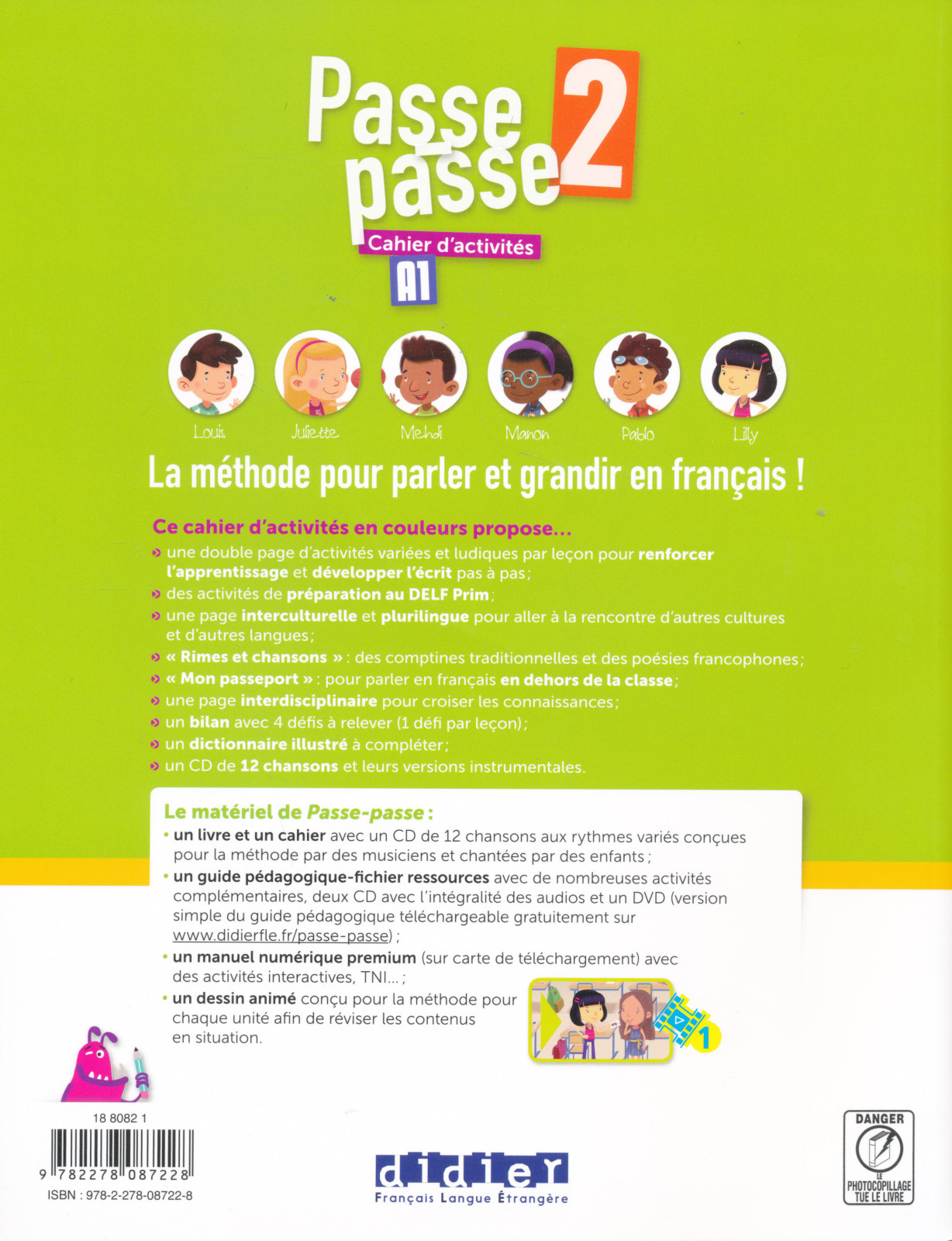 Le cahier d'activités en couleurs propose :- une double page d’activités variées et ludiques par leçon pour renforcer l’apprentissage et développer l’écrit pas a pas ;- des activités de préparation au DELF Prim ;- une page interculturelle et plurilingue pour aller a la rencontre d’autres cultures et d’autres langues ;- « Rimes et chansons » : des comptines traditionnelles et des poésies francophones ;- « Mon passeport » : pour parler en français en dehors de la classe ;- une page interdisciplinaire pour croiser les connaissances ;- un bilan avec 4 défis a relever (1 défi par leçon) ;- un dictionnaire illustré a compléter ;- un CD de 12 chansons et leurs versions instrumentales.