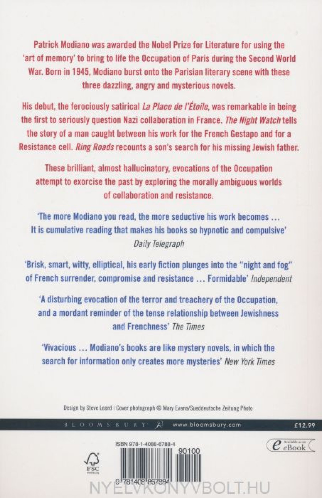 When Patrick Modiano was awarded the 2014 Nobel Prize for Literature he was praised for using the 'art of memory' to bring to life the Occupation of Paris during the Second World War. Born in 1945, Modiano's brilliant, angry writings burst onto the Parisian literary scene and caused a storm. His first, ferociously satirical novel, La Place de l'Étoile, was remarkable in seriously questioning both Nazi collaboration in France and the myths of the Gaullist era. The Night Watch tells the story of a man caught between his work for the French Gestapo and for a Resistance cell. Ring Roads recounts a son's search for his Jewish father, who disappeared ten years previously.