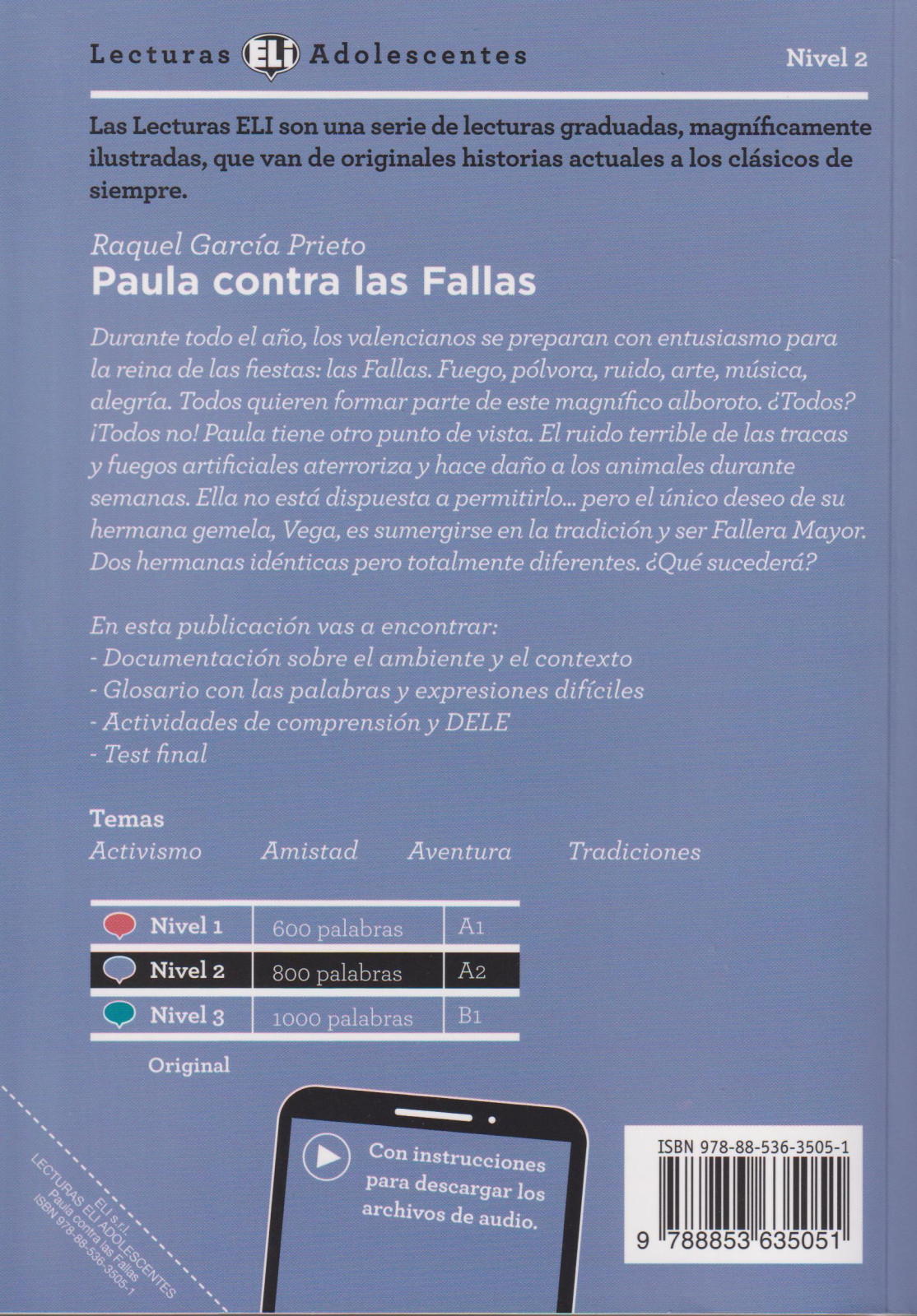 Fuego, pólvora, ruido, arte, música, alegría. Todos quieren formar parte de este magnífico alboroto. ?Todos? !Todos no! Paula tiene otro punto de vista. El ruido terrible de las tracas y fuegos artificiales aterroriza y hace dano a los animales durante semanas. Ella no está dispuesta a permitirlo... pero el único deseo de su hermana gemela, Vega, es sumergirse en la tradición y ser Fallera Mayor. Dos hermanas idénticas pero totalmente diferentes. ?Qué sucederá?Contenidos gramaticalesPresente de indicativo, Pasados (Pretérito imperfecto, indefinido y perfecto), Verbos reflexivos y pronominales, Colocaciones y frases hechas, Usos de los verbos ser y estar, Perífrasis de futuro ir a + infinitivo, Preposiciones más comunes