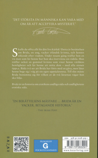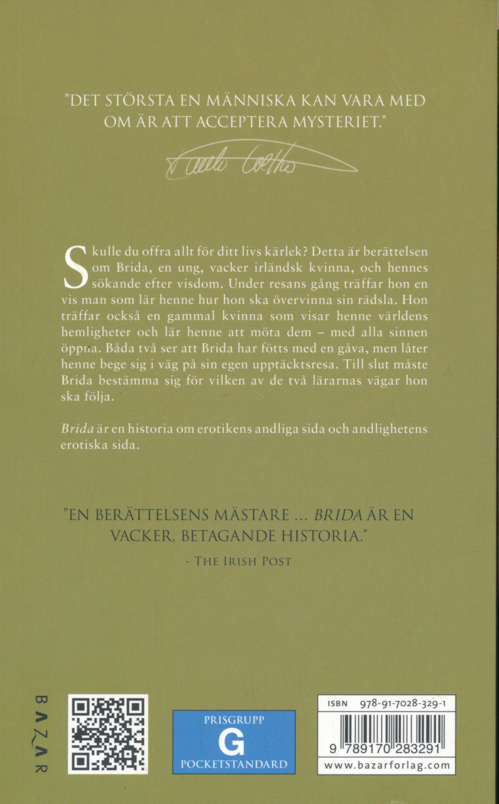 Mästaren tvekar, trots att han ser att hon har en gava, men beslutar sig sedan för att ställa henne inför en rad hinder som ska hjälpa henne att övervinna sin rädsla. Sökandet efter magin leder henne ocksa till häxan Wicca, som börjar undervisa henne i häxornas grundläggande mysterier. Med Wiccas hjälp ger sig Brida ut pa en inre resa för att finna sin gava; hon upptäcker andra liv och reinkarnationer och maste konfronteras med sin längtan, sina farhagor, sin oro.