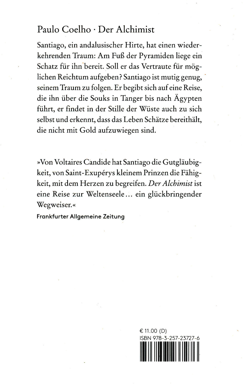 Der brasilianische Geschichtenerzähler Paulo Coelho macht uns mit Santiago bekannt, einem andalusischen Hirtenjungen, der eines Nachts von einem fernen Schatz in den ägyptischen Pyramiden träumt. Und so macht sich Santiago auf den Weg.