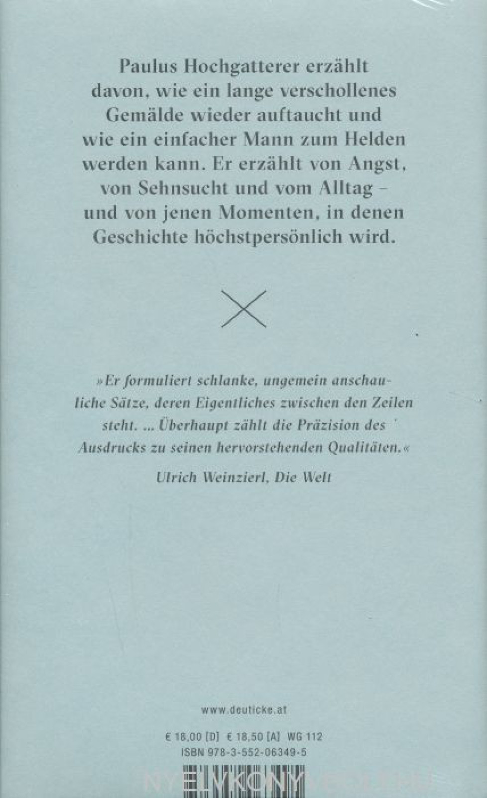 Im Oktober 1944 taucht auf einem Bauernhof in Niederösterreich ein ungefähr dreizehnjähriges Mädchen auf, verstört und offenbar ohne Erinnerung. Nelli wird aufgenommen und wächst in die Familie hinein. Einige Monate später kommt eines Nachts ein junger Russe auf den Hof. Er hat nichts bei sich außer einer Leinwandrolle, die er hütet wie seinen Augapfel. Zwischen ihm und dem Mädchen entspinnt sich eine zarte Beziehung, die durch das Eintreffen einer Gruppe von Wehrmachtssoldaten jäh unterbrochen wird. Glanzvoll und fulminant erzählt Paulus Hochgatterer die Geschichte eines verschollenen Gemäldes – und von einem einfachen Mann, der zum Helden wird.