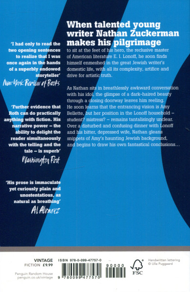of literature and experience while an overnight guest in the secluded New England farmhouse of his literary idol, E. I. Lonoff. At Lonoff’s, Zuckerman meets Amy Bellette, a haunting young woman of indeterminate foreign background who turns out to be a former student of Lonoff’s and who may also have been his mistress. Zuckerman, with his active, youthful imagination, wonders if she could be the paradigmatic victim of Nazi persecution. If she were, it might change his life… This is the first volume of the trilogy and epilogue Zuckerman Bound.
