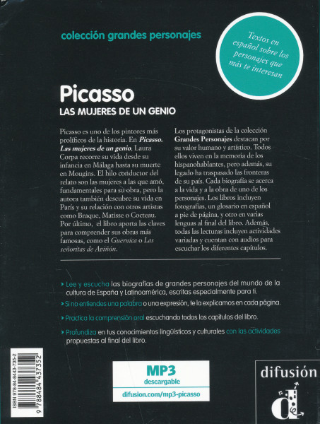 El hilo conductor del relato son las mujeres a las que amó, fundamentales para su obra, pero la autora también descubre su vida en París y su relación con otros artistas como Braque, Matisse o Cocteau. Por último, el libro aporta las claves para comprender sus obras más famosas, como el Guernica o Las senoritas de Avinón. Los protagonistas de la colección Grandes personajes destacan por su valor humano y artístico. Todos ellos viven en la memoria de los hispanohablantes, pero además, su legado ha traspasado las fronteras de su país. Cada biografía se acerca a la vida y a la obra de uno de los personajes. Los libros incluyen fotografías, un glosario en espanol a pie de página, y otro en varias lenguas al final del libro. Además, todas las lecturas van acompanadas de actividades variadas y de un CD donde se puede escuchar el relato.