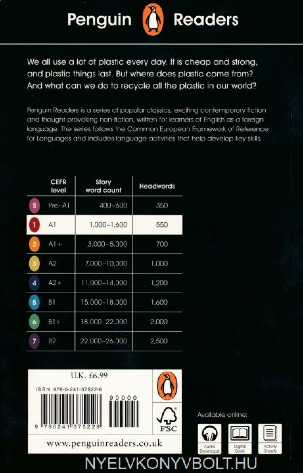 Penguin Readers is a series of popular classics, exciting contemporary fiction, and thought-provoking non-fiction written for learners of English as a foreign language. Beautifully illustrated and carefully adapted, the series introduces language learners around the world to the bestselling authors and most compelling content from Penguin Random House. The eight levels of Penguin Readers follow the Common European Framework and include language activities that help readers to develop key skills.Plastic, a Level 1 Reader, is A1 in the CEFR framework. Short sentences contain a maximum of two clauses, introducing the past simple tense and some simple modals, adverbs and gerunds. Illustrations support the text throughout, and many titles at this levelare graphic novels.