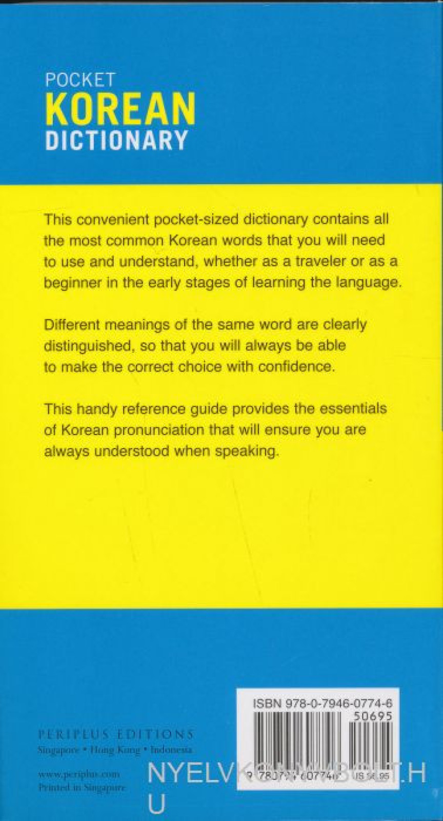 Intended for use by tourists, students, and business people traveling to Korea Pocket Korean Dictionary is an essential tool for communication and a great way to learn Korean. It features all the critical Korean vocabulary appropriate for beginning to intermediate students. It's handy pocket format, and easy-to-read type will make any future trip to Korea much more manageable.In addition to being an excellent English to Korean dictionary and Korean to English dictionary Pocket Korean Dictionary contains relevant notes on the Korean language, Korean grammar and Korean pronunciation. All Korean words are written in English as well as Korean script (hangul) so that in the case of difficulties the book can directly be shown to a native Korean speaker.