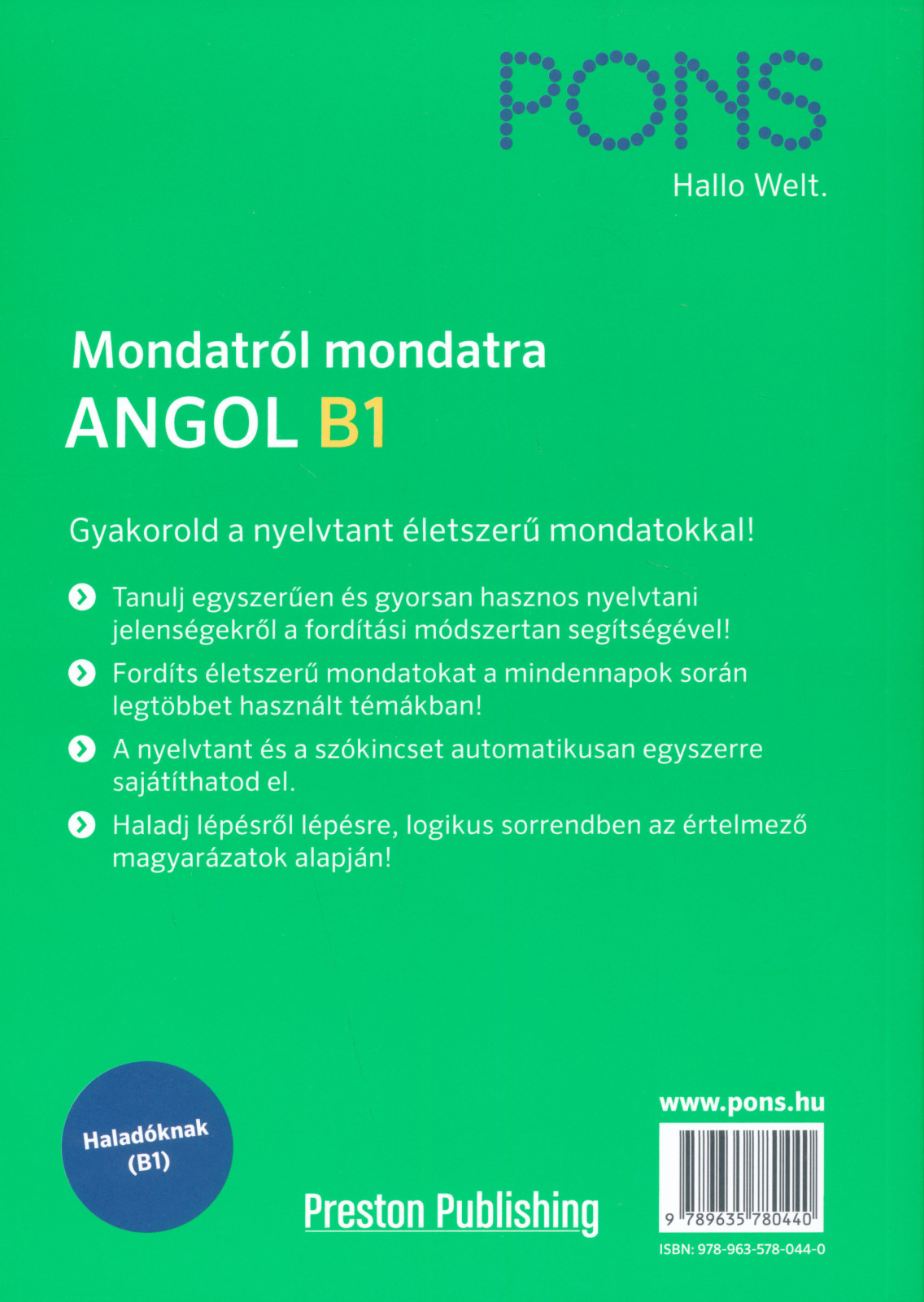 Az átgondolt szerkesztésnek köszönhetően a nyelvtant és a szókincset automatikusan egyszerre sajátíthatod el, továbbá áttekinthető egységekben magyarázzuk el az angol nyelvtan legfontosabb szabályait.Tanuld meg egyszerűen és gyorsan az angol nyelvtan különféle szabályait a fordítási módszertan segítségével!- Fordíts 35 témában 1200 mondatot! Segítségedre van 140 magyarázat és minden fordítás megoldása.- Haladj lépésről lépésre, logikus sorrendben az értelmező magyarázatok alapján!- A megoldásokat és a nyelvtani magyarázatokat nem kell a könyv végén keresned – mindig a könyv jobb oldalán találod.
