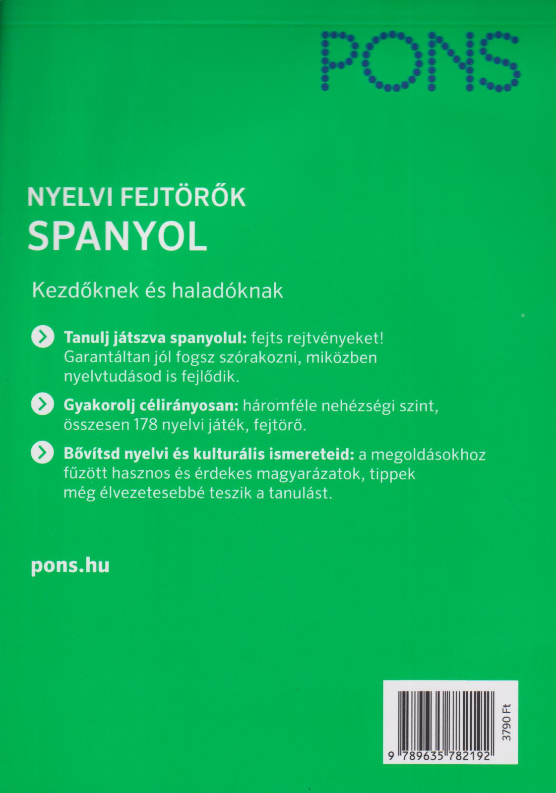 Tanulj játszva spanyolul: fejts rejtvényeket! Garantáltan jól fogsz szórakozni, miközben a spanyol nyelvtudásod is fejlődik.Gyakorolj célirányosan: háromféle nehézségi szint, összesen 178 nyelvi játék, fejtörő.Bővítsd nyelvi és kulturális ismereteid: a megoldásokhoz fűzött hasznos és érdekes magyarázatok, tippek még élvezetesebbé teszik a tanulást.Ellenőrizd magad: minden lap hátoldalán azonnal ott vannak a megoldások.