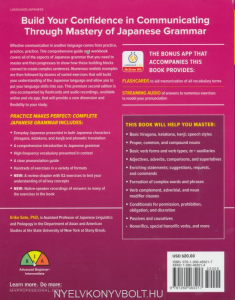 This updated, new edition boasts audio support online and via mobile app, ensuring you’ll speak the language as well as you write and speak it. The answers to more than 100 exercises in the book have been recorded and are available via the McGraw-Hill Language Lab app, and you can also (depending on your mobile device’s capabilities) record your own answers to compare with native speakers. • 200 exercises in 15 units covering all aspects of Japanese grammar, with explanations that include useful/helpful comparisons with English grammar?including hiragana, katakana, and kanji script • Author has a proven teaching record, with extensive experience as an educator and curriculum developer• All example sentences are written in Japanese script, with Romanization alongside to help pronunciation• Exercises for use either in the classroom use or for individual study• New to this edition: recordings of answers to many exercises throughout book