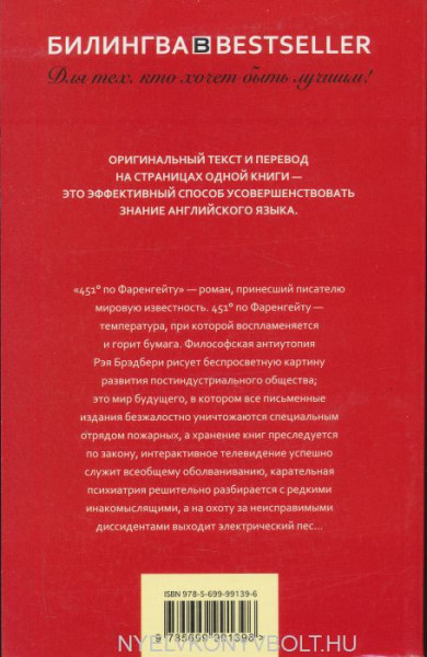 Kogda interaktivnoe televidenie uspeshno sluzhit vseobschemu obolvanivaniju, karatelnaja psikhiatrija reshitelno razbiraetsja s redkimi inakomysljaschimi, a na okhotu za neispravimymi dissidentami vykhodit elektricheskij pes?"451 po Farengejtu" - odna iz samykh izvestnykh i samykh chitaemykh knig v mire. I eto zalog togo, chto vymysel Bredberi nikogda ne stanet realnostju.
