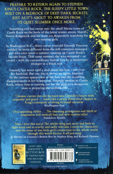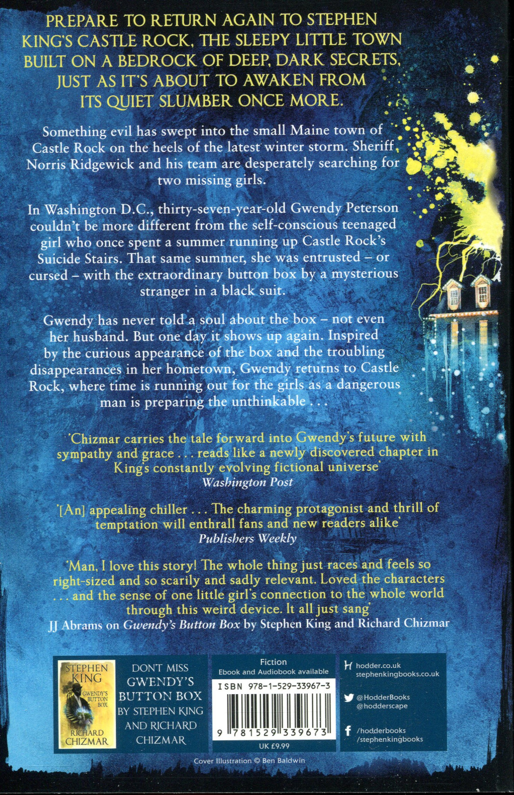 In Washington D.C., thirty-seven-year-old Gwendy Peterson couldn't be more different from the self-conscious teenaged girl who once spent a summer running up Castle Rock's Suicide Stairs. That same summer, she was entrusted - or cursed - with the extraordinary button box by a mysterious stranger in a black suit.Gwendy has never told a soul about the box - not even her husband. But one day it shows up again. Inspired by the curious appearance of the box and the troubling disappearances in her hometown, Gwendy returns to Castle Rock, where time is running out for the girls as a dangerous man is preparing the unthinkable . . .