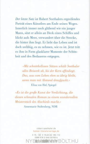 An Deck eines Schiffes auf dem Weg von New York nach Europa sitzt Gustav Mahler. Er ist berühmt, der größte Musiker der Welt, doch sein Körper schmerzt, hat immer schon geschmerzt. Während ihn der Schiffsjunge sanft, aber resolut umsorgt, denkt er zurück an die letzten Jahre, die Sommer in den Bergen, den Tod seiner Tochter Maria, die er manchmal noch zu sehen meint. An Anna, die andere Tochter, die gerade unten beim Frühstück sitzt, und an Alma, die Liebe seines Lebens, die ihn verrückt macht und die er längst verloren hat. Es ist seine letzte Reise."Der letzte Satz" ist das ergreifende Porträt eines Künstlers als müde gewordener Arbeiter, dem die Vergangenheit in Form glasklarer Momente der Schönheit und des Bedauerns entgegentritt.