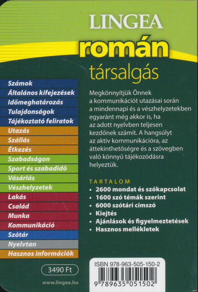 A hangsúlyt az aktív kommunikációra, az áttekinthetőségre és a szövegben való könnyű tájékozódásra fektettük. A kiadvány 2600 mondat és szókapcsolat mellett 6000 szótári címszót is tartalmaz. A praktikus példamondatokat az olyan általános, hétköznapokban használt témák esetében gyűjtöttük össze, mint az utazás, szállás, étkezés, vásárlás, sport, szabadidő, kommunikáció. A Lingea társalgási kézikönyvében minden kifejezés mellett feltüntettük annak kiejtését is. Hasznos melléklet a kétoldali szótár, az országban történő utazáshoz szükséges alapvető információk illusztrálása és Románia látványosságait bemutató mini-útikalauz.