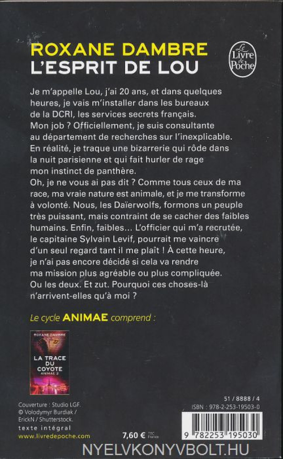Je m’appelle Lou, j’ai 20 ans, et dans quelques heures, je vais m’installer dans les bureaux de la DCRI, les services secrets français. Mon job ? Officiellement, je suis consultante au département de recherche sur l’inexplicable. En réalité, je traque une bizarrerie qui rôde dans la nuit parisienne et qui fait hurler de rage mon instinct de panthere. Oh, je ne vous ai pas dit ? Comme tous ceux de ma race, ma vraie nature est animale, et je me transforme a volonté. Nous, les Daierwolfs, formons un peuple tres puissant, mais contraint de se cacher des faibles humains. Enfin, faibles... L’officier qui m’a recrutée, le capitaine Sylvain Levif, pourrait me vaincre d’un seul regard tant il me plaît ! A cette heure, je n’ai pas encore décidé si cela va rendre ma mission plus agréable ou plus compliquée. Ou les deux. Et zut. Pourquoi ces choses-la n’arrivent-elles qu’a moi ?