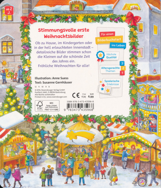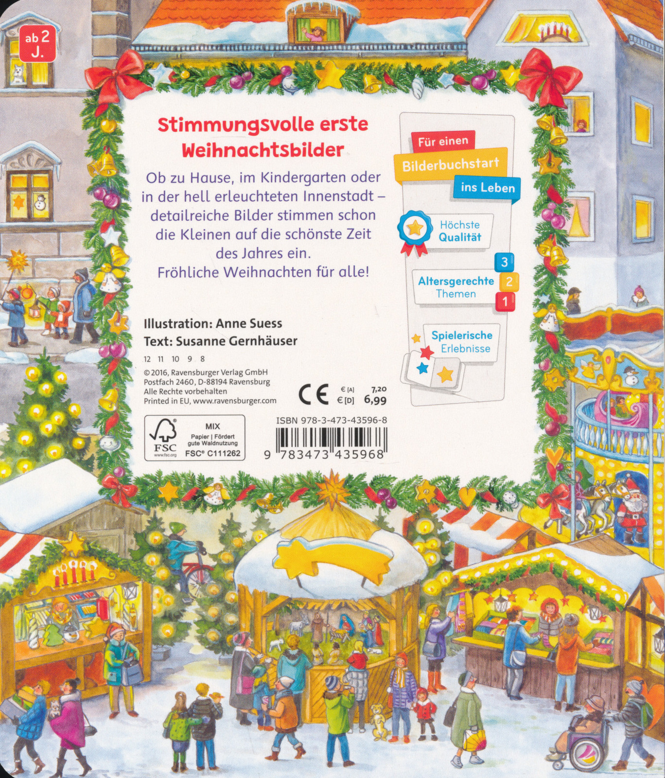Elf stimmungsvoll illustrierte Weihnachtsbilder stimmen auf die schönste Zeit des Jahres ein. Überall geht es ganz weihnachtlich zu. Im Kindergarten wird gebastelt und zu Hause gebacken. Auf den Straßen in der Innenstadt leuchten die Lichter und auf demWeihnachtsmarkt kann man einen Tannenbaum für das Fest kaufen. Das beliebte und kinderleichte Suchprinzip mit den kleinen Bildern an den Seitenrändern macht großen Spaß und unterstützt die Konzentrationsfähigkeit. Ein ideales Familienbuch zur Vorbereitung und Einstimmung auf das Weihnachtsfest.