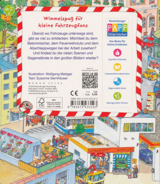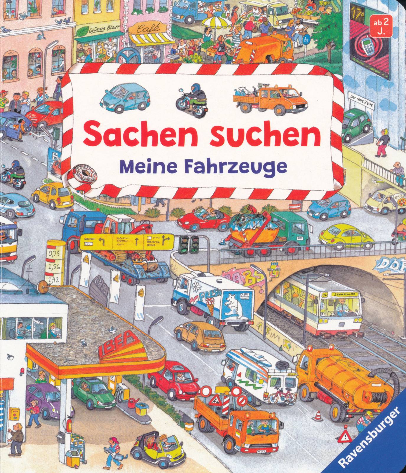 Auf elf Wimmelbildern gibt es unendlich viel zum Thema Fahrzeuge zu entdecken. Damit das genaue Hinsehen noch mehr Spaß macht, wurden Szenen und Gegenstände aus den Bildern als Suchvignetten zum "Sachen suchen" danebengestellt.