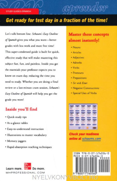 Schaum's Easy Outline of Spanish is a pared-down, simplified, and tightly focused review of the topic. With an emphasis on clarity and brevity, it features a streamlined and updated format and the absolute essence of the subject, presented in a concise and readily understandable form. Graphic elements such as sidebars, reader-alert icons, and boxed highlights stress selected points from the text, illuminate keys to learning, and give you quick pointers to the essentials. If you are looking for a quick nuts-and-bolts overview, turn to Schaum's Easy Outlines!