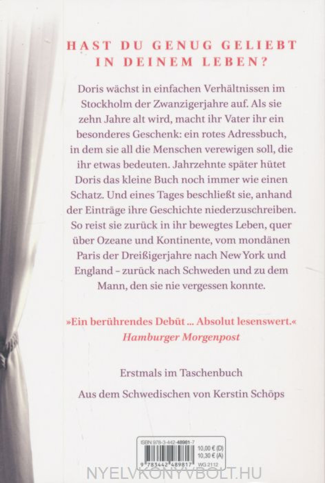 Doris wächst in einfachen Verhältnissen im Stockholm der Zwanzigerjahre auf. Als sie zehn Jahre alt wird, macht ihr Vater ihr ein besonderes Geschenk: ein rotes Adressbuch, in dem sie all die Menschen verewigen soll, die ihr etwas bedeuten. Jahrzehnte später hütet Doris das kleine Buch noch immer wie einen Schatz. Und eines Tages beschließt sie, anhand der Einträge ihre Geschichte niederzuschreiben. So reist sie zurück in ihr bewegtes Leben, quer über Ozeane und Kontinente, vom mondänen Paris der Dreißigerjahre nach New York und England – zurück nach Schweden und zu dem Mann, den sie nie vergessen konnte.