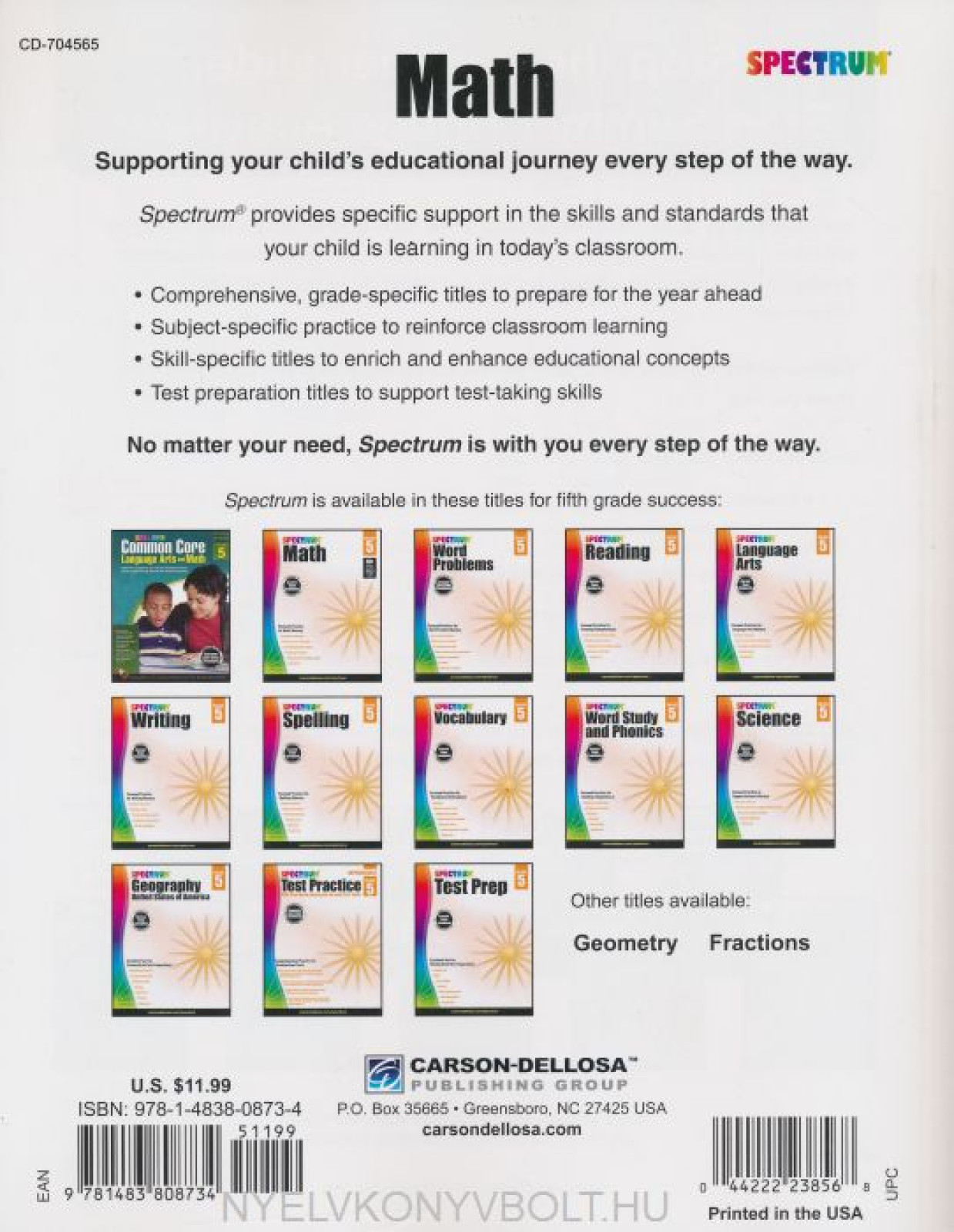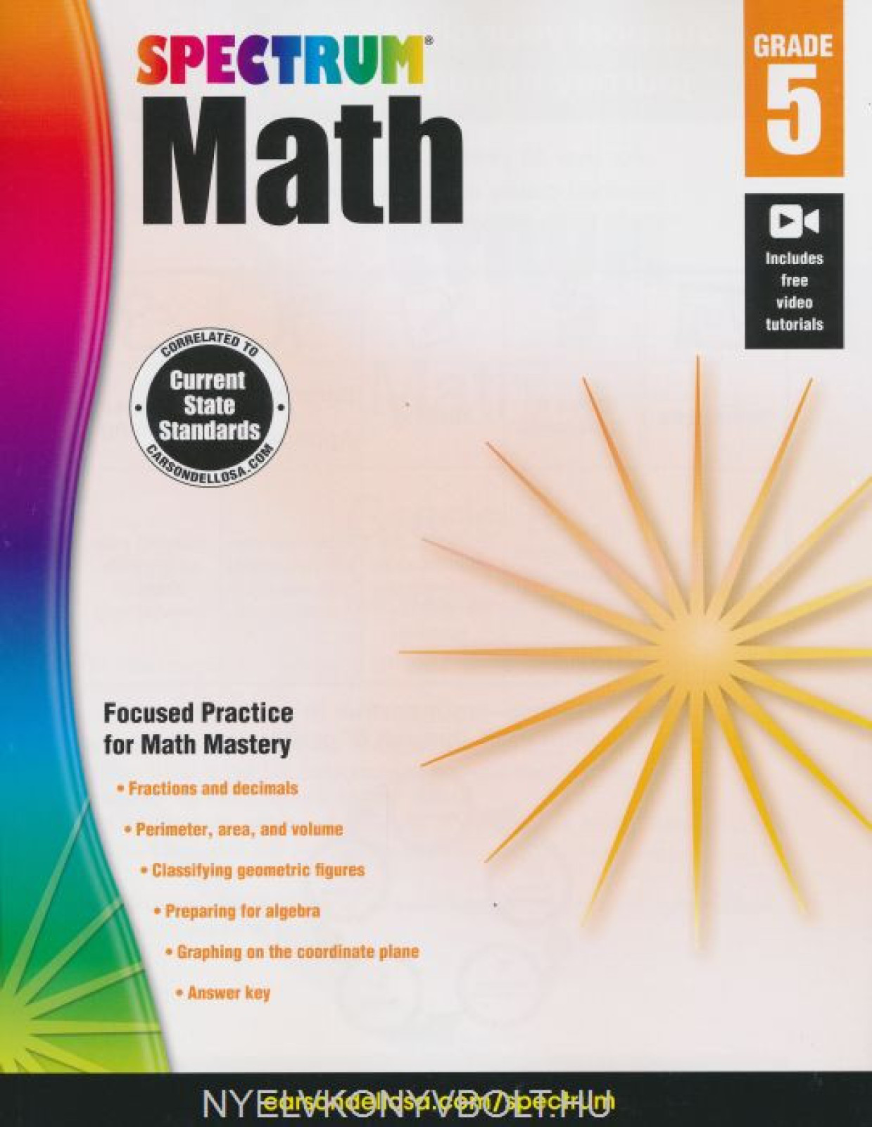 Spectrum Math for grade 5 keeps kids at the top of their math game using progressive practice, math in everyday settings, and tests to monitor progress. The math workbook covers fractions, decimals, multiplication, division, and preparing for algebra.A best-selling series for well over 15 years, Spectrum still leads the way because it works. It works for parents who want to give their child a leg up in math. It works for teachers who want their students to meet?and surpass?learning goals. And it works to help children build confidence and advance their skills. No matter what subject or grade, Spectrum provides thorough practice and focused instruction to support student success.