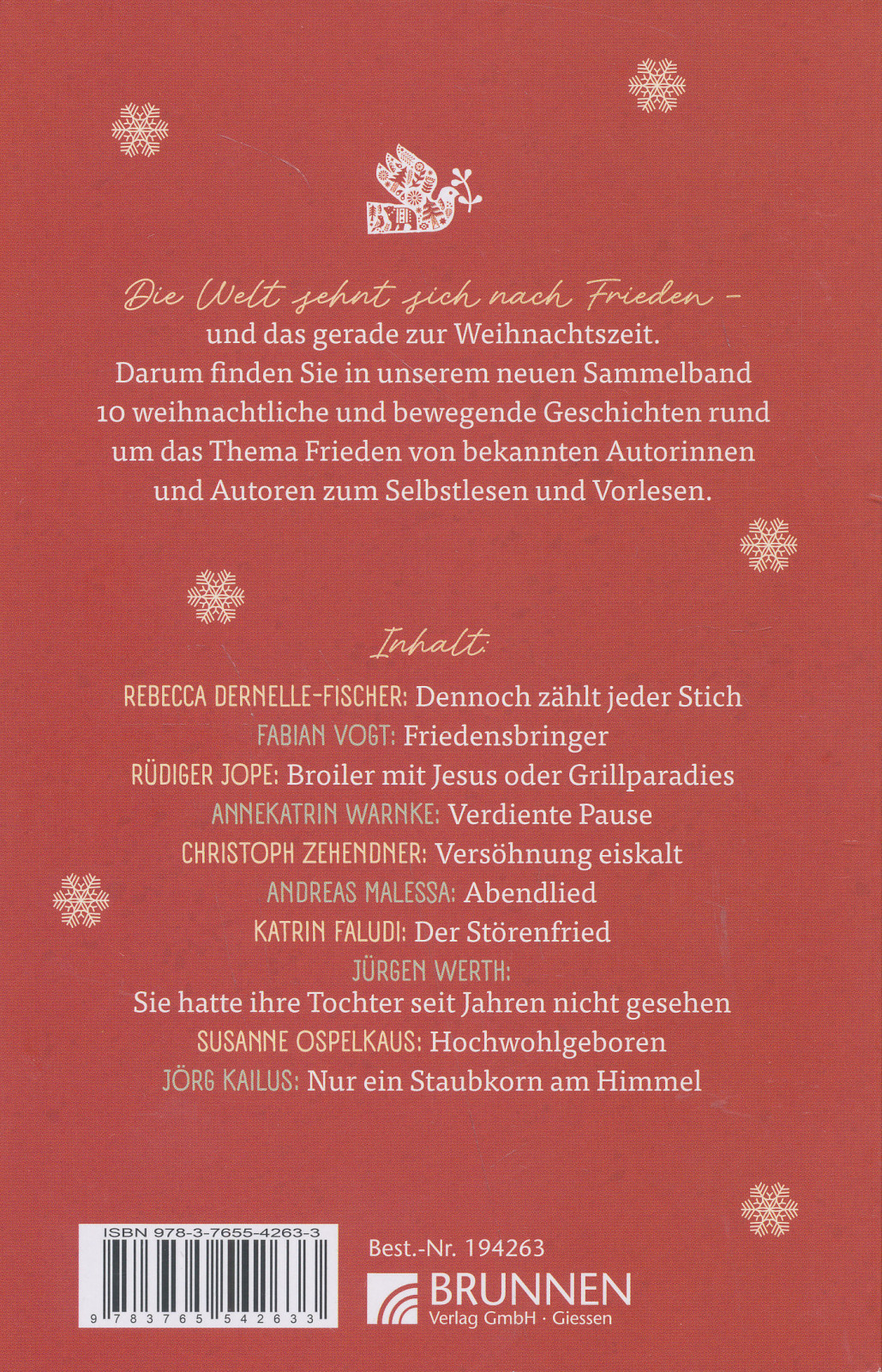 Die Welt sehnt sich nach Frieden - und das gerade zur Weihnachtszeit. Darum versammelt unser neuer Sammelband, herausgegeben von Stefan Loß, 10 weihnachtliche und bewegende Geschichten rund um das Thema Frieden von bekannten Autorinnen und Autoren.