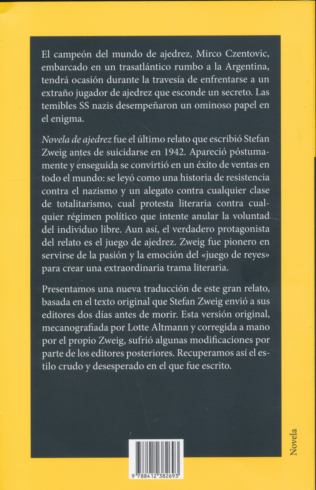 El campeón del mundo de ajedrez, Mirco Czentovic, embarcado en un trasatlántico rumbo a la Argentina, tendrá ocasión durante la travesía de enfrentarse a un extrano jugador de ajedrez que esconde un secreto. Las temibles SS nazis desempenaron un ominosopapel en el enigma. Novela de ajedrez fue el último relato que escribió Stefan Zweig antes de suicidarse en 1942. Apareció póstumamente y enseguida se convirtió en un éxito de ventas en todo el mundo: se leyó como una historia de resistencia contra el nazismo y un alegato contra cualquier clase de totalitarismo, cual protesta literaria contra cualquier régimen político que intente anular la voluntad del individuo libre. Aun así, el verdadero protagonista del relato es el juego de ajedrez. Zweig fue pionero en servirse de la pasión y la emoción del «juego de reyes» para crear una extraordinaria trama literaria.