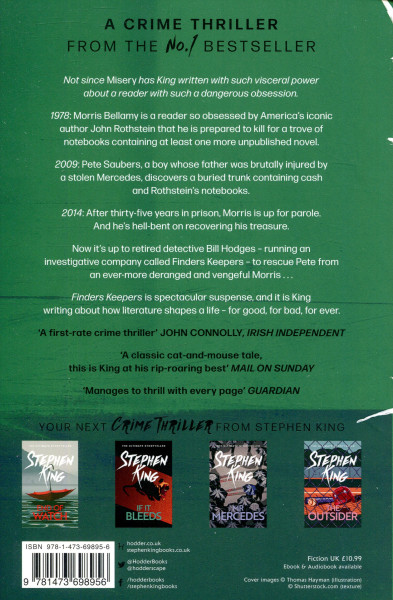2009: Pete Saubers, a boy whose father was brutally injured by a stolen Mercedes, discovers a buried trunk containing cash and Rothstein's notebooks.2014: After thirty-five years in prison, Morris is up for parole. And he's hell-bent on recovering his treasure.Now it's up to retired detective Bill Hodges - running an investigative company called Finders Keepers with Holly Gibney - to rescue Pete from an ever-more deranged and vengeful Morris