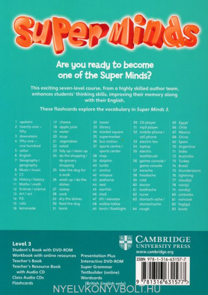 Super Minds is a seven-level course for young learners. This exciting seven-level course enhances your students' thinking skills, sharpening their memory and improving their concentration along with their language skills.