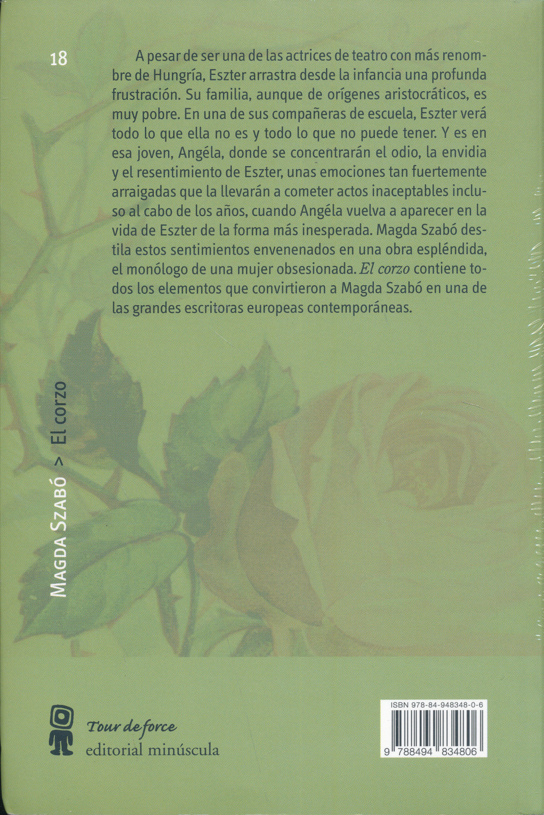 A pesar de ser una de las actrices de teatro con más renombre de Hungría, Eszter arrastra desde la infancia una profunda frustración. Su familia, aunque de orígenes aristocráticos, es muy pobre. En una de sus companeras de escuela, Eszter verá todo lo que ella no es y todo lo que no puede tener. Y es en esa joven, Angéla, donde se concentrarán el odio, la envidia y el resentimiento de Eszter, unas emociones tan fuertemente arraigadas que la llevarán a cometer actos inaceptables incluso al cabo de los anos, cuando Angéla vuelva a aparecer en la vida de Eszter de la forma más inesperada. Magda Szabó destila estos sentimientos envenenados en una obra espléndida, el monólogo de una mujer obsesionada. El corzo contiene todos los elementos que convirtieron a Magda Szabó en una de las grandes escritoras europeas contemporáneas.