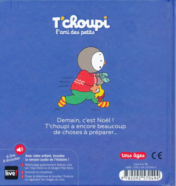 Résumé de cette histoire : Demaon c'est Noël ! T'choupi a encore beaucoup de choses a préparer...Nouveau : avec votre enfant écoutez la version audio de l'histoire !Tous les albums T'choupi sont maintenant accompagnés d'une version audio, accessiblegratuitement en scannant la couverture avec l'application Nathan Live.Des livres pour les enfants de 2 a 4 ans conçus dans un format idéal pour les petites mains : coins arrondis, pages plastifiées résistantes.