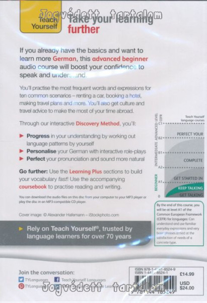 Practise the most frequent words and expressions for:-renting a car-booking a hotel room-meeting at a party-ordering starters and drinks-ordering a main course and a dessert-talking about yourself and your family-talking about likes and dislikes-travelling about town-making arrangements-talking about a weekend break.You'll progress in your understanding by working out language patterns for yourself, personalize your German with interactive role-plays and perfect your pronunciation to sound more natural.This advanced beginner German course contains an MP3 CD. You can download the audio files on this disc from your computer to your MP3 player or play it in an MP3 CD player. Also included is a handy phrasebook and a PDF coursebook for reading and writing practice.Keep Talking German - Ten Days to Confidence maps to A1 of the Common European Framework of Reference (CEFR) for languages.Rely on Teach Yourself, trusted by language learners for over 75 years.