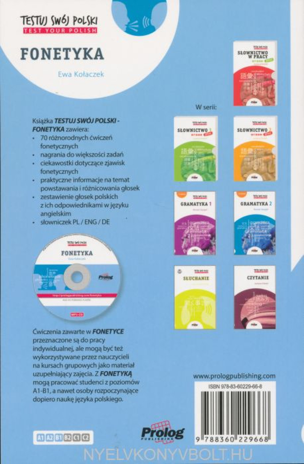 Obcokrajowcy znajdą tu szeroki wybór ćwiczeń poświęconych wymowie i różnicowaniu m.in. kłopotliwych głosek szeregu ciszącego (ś, ź, ć, dź), szumiącego (sz, ż, cz, dż), grup spółgłoskowych (ść, szcz, źdź, żdż) czy samogłosek nosowych ą, ę. Zawarte w FONETYCE zadania pomogą też sprawdzić i usystematyzować wiadomości związane z intonacją, akcentem i zjawiskami fonetycznymi, zachodzącymi w języku polskim w obrębie samego słowa, jak i całego zdania. Integralną częścią FONETYKI są nagrania, służące m.in. prezentacji wzorcowej wymowy wszystkich samogłosek i spółgłosek. Dzięki nagraniom osoby uczące się języka polskiego jako obcego mogą doskonalić percepcję i różnicowanie wybranych głosek, a także mają możliwość skonfrontowania swojej wymowy z modelową wymowąpolskich lektorów. Ćwiczenia zawarte w FONETYCE przeznaczone są do pracy indywidualnej, ale mogą być też wykorzystywane przez nauczycieli na kursach grupowych jako materiał uzupełniający zajęcia.