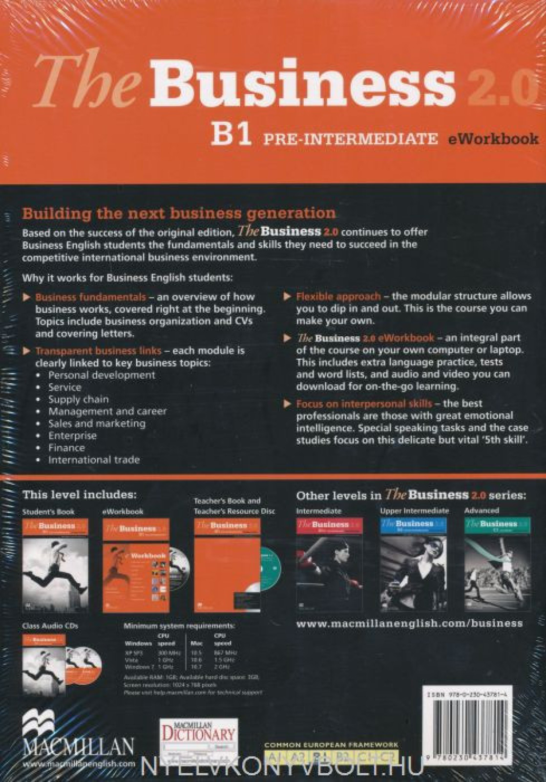 Providing a thoroughly researched topic-based approach to learning business English, The Business offers a truly blended learning package including a useful e-workbook.Key benefits include: ---------------------? A revised edition of the popularbusiness English textbook which provides a thoroughly researched topic based approach to learning business English. ? The Student’s Book contains 48 modules in eight units. There are six different types of module: About Business, Vocabulary, Grammar, Speaking, Writing and a Case Study. ? The Business eWorkbook provides everything you would find in a printed workbook, as well as extra multimedia resources.