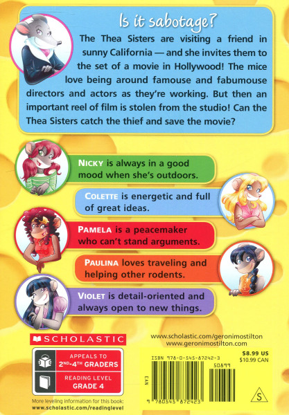 The Thea Sisters are visiting a friend in sunny California -- and she invites them to the set of a movie in Hollywood! The mice love being around famouse and fabumouse directors and actors as they're working. But then an important reel of film is stolenfrom the studio! Can the Thea Sisters catch the thief and save the movie?