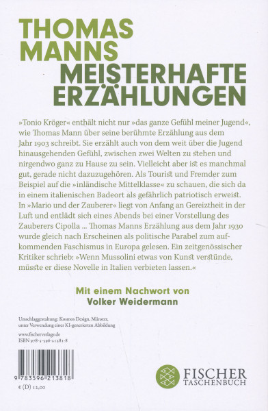 Tonio Kröger, eine "Prosa-Ballade", und Mario und der Zauberer, "eine stark ins Politische hinüberspielende Geschichte" - zwei gegensätzliche Erzählungen, in denen Thomas Mann seine "Kunst des psychologischen Realismus zur Meisterschaft gesteigert" hat.