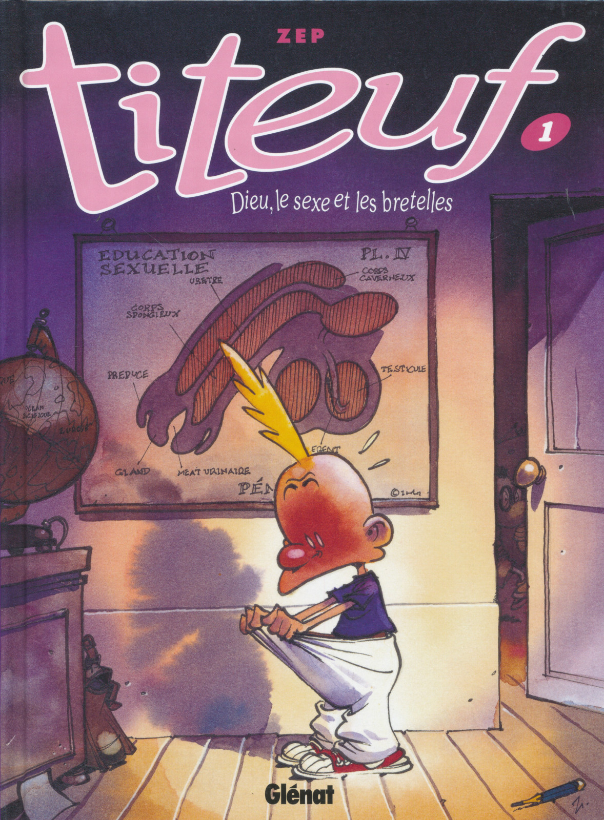 « Si Dieu est parmi nous comme la prof elle a dit, c’est en tout cas pas Hugo, il est trop gros, ni Manu, ni François parce qu’ils ont des binocles... Dimi c’est pas possible, il parle meme pas bien français... Il reste que Ludo mais ça veut dire que Dieu sait pas faire pipi debout. »Titeuf n’est pas le caid de la cour de récré, mais il est le «sale gosse» préféré des lecteurs et, il y a 17 ans, comme un OVNI dans le paysage éditorial de l’époque, sortait le premier album de Titeuf. 11 albums plus tard, Zep a entraîné des millions de lecteurs du monde entier et créé un phénomene unique. Dieu, le sexe et les bretelles était paru en noir et blanc : Zep a décidé d’y revenir, pour lui donner un net coup de jeune, et confie pour cela la colorisation a Nob.