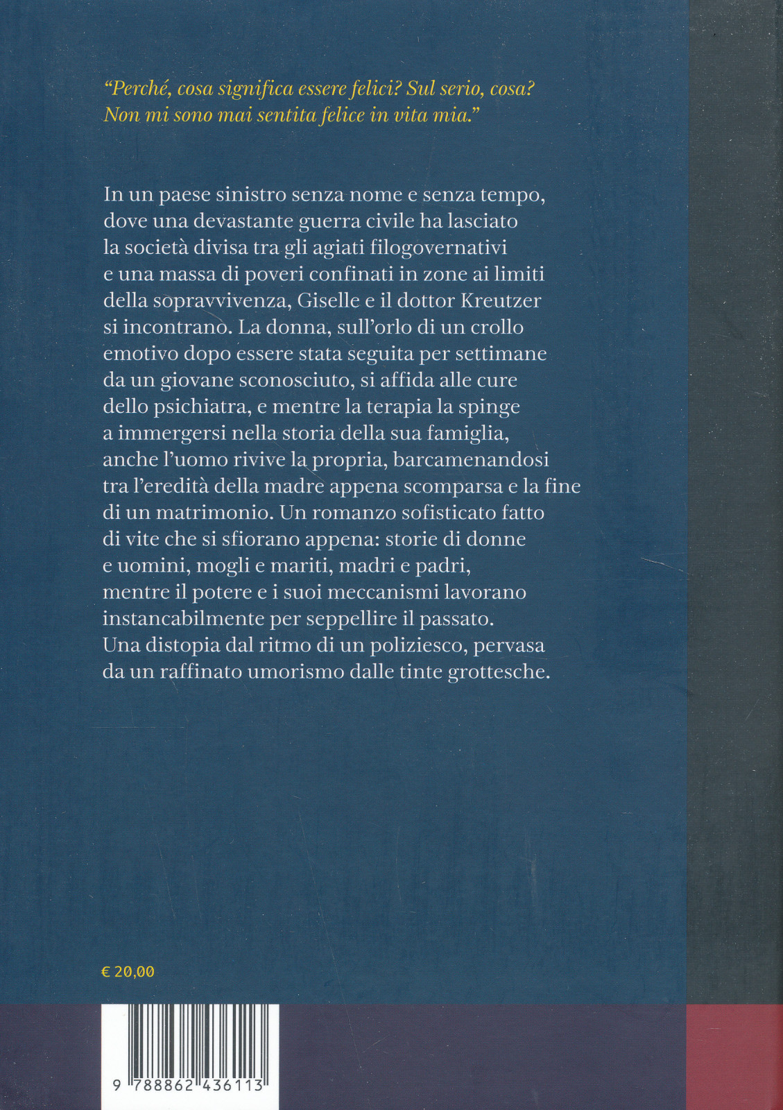 ...Giselle e il dottor Kreutzer si incontrano. La donna, sull’orlo di un crollo emotivo dopo essere stata seguita per settimane da un giovane sconosciuto, si affida alle cure dello psichiatra, e mentre la terapia la spinge a immergersi nella storia della sua famiglia, anche l’uomo rivive la propria, barcamenandosi tra l’eredita della madre appena scomparsa e la fine di un matrimonio. Un romanzo sofisticato fatto di vite che si sfiorano appena: storie di donne e uomini, mogli e mariti, madri e padri, mentre il potere e i suoi meccanismi lavorano instancabilmente per seppellire il passato. Una distopia dal ritmo di un poliziesco, pervasa da un raffinato umorismo dalle tinte grottesche.