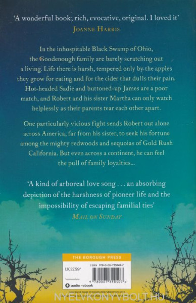 Ohio, 1838. James and Sadie Goodenough have settled in the Black Swamp, planting apple trees to claim the land as their own. Life is harsh in the swamp, and as fever picks off their children, husband and wife take solace in separate comforts. James patiently grows his sweet-tasting ‘eaters’ while Sadie gets drunk on applejack made fresh from ‘spitters’. Their fighting takes its toll on all of the Goodenoughs – a battle that will resonate over the years and across America.