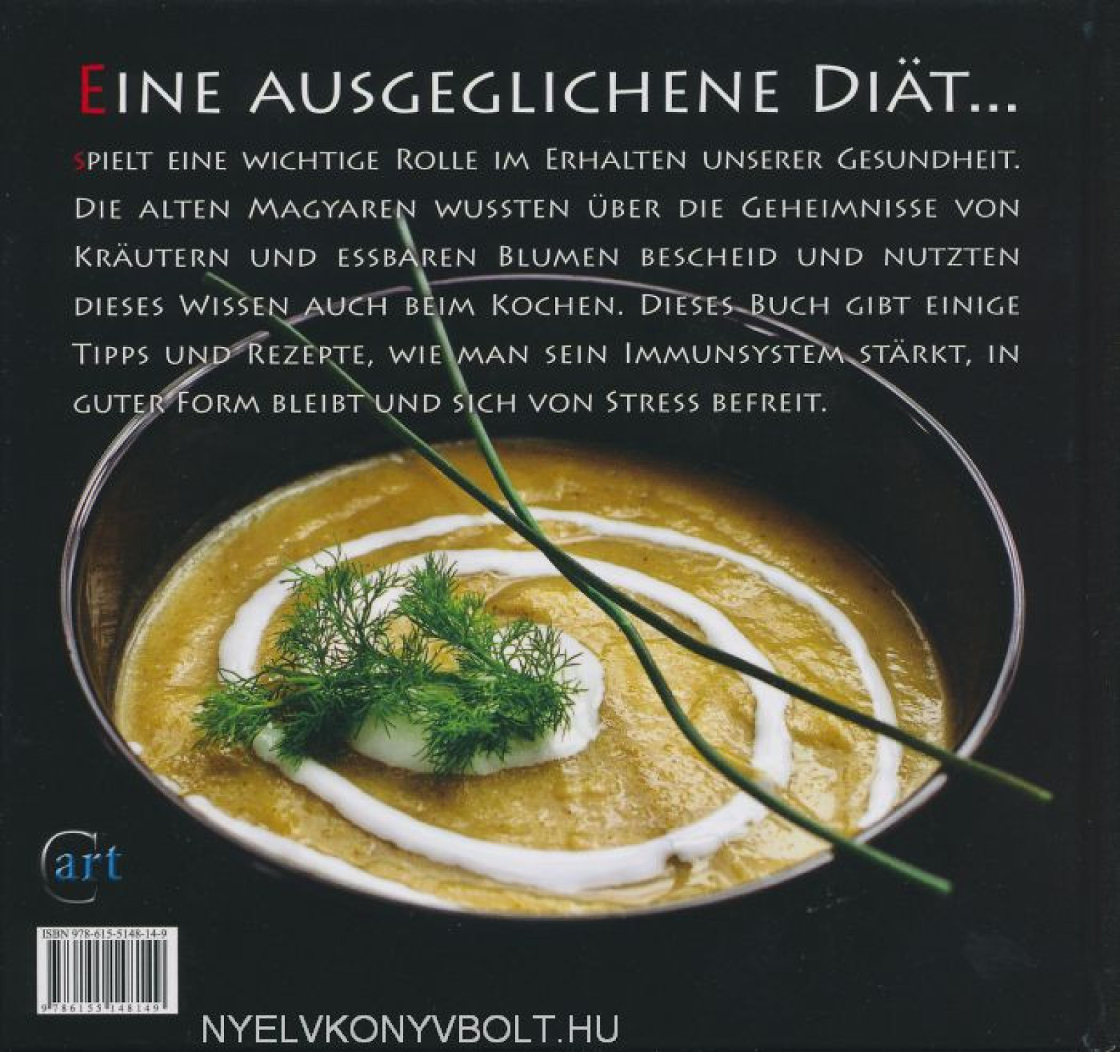 Spielt eine wichtige Rolle im Erhalten unserer Gesundheit. Die alten Magyaren wussten über die Geheimnisse von Krautern und essbaren Blumen bescheid und nutzten dieses wissen auch beim Kochen. Dieses buch gibt einige Tipps und Rezepte, wie man sein Immunsystem starkt, in guter Form bleibt und sich von Stress befreit.