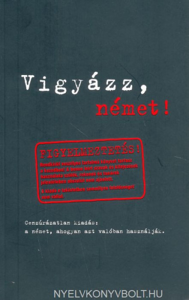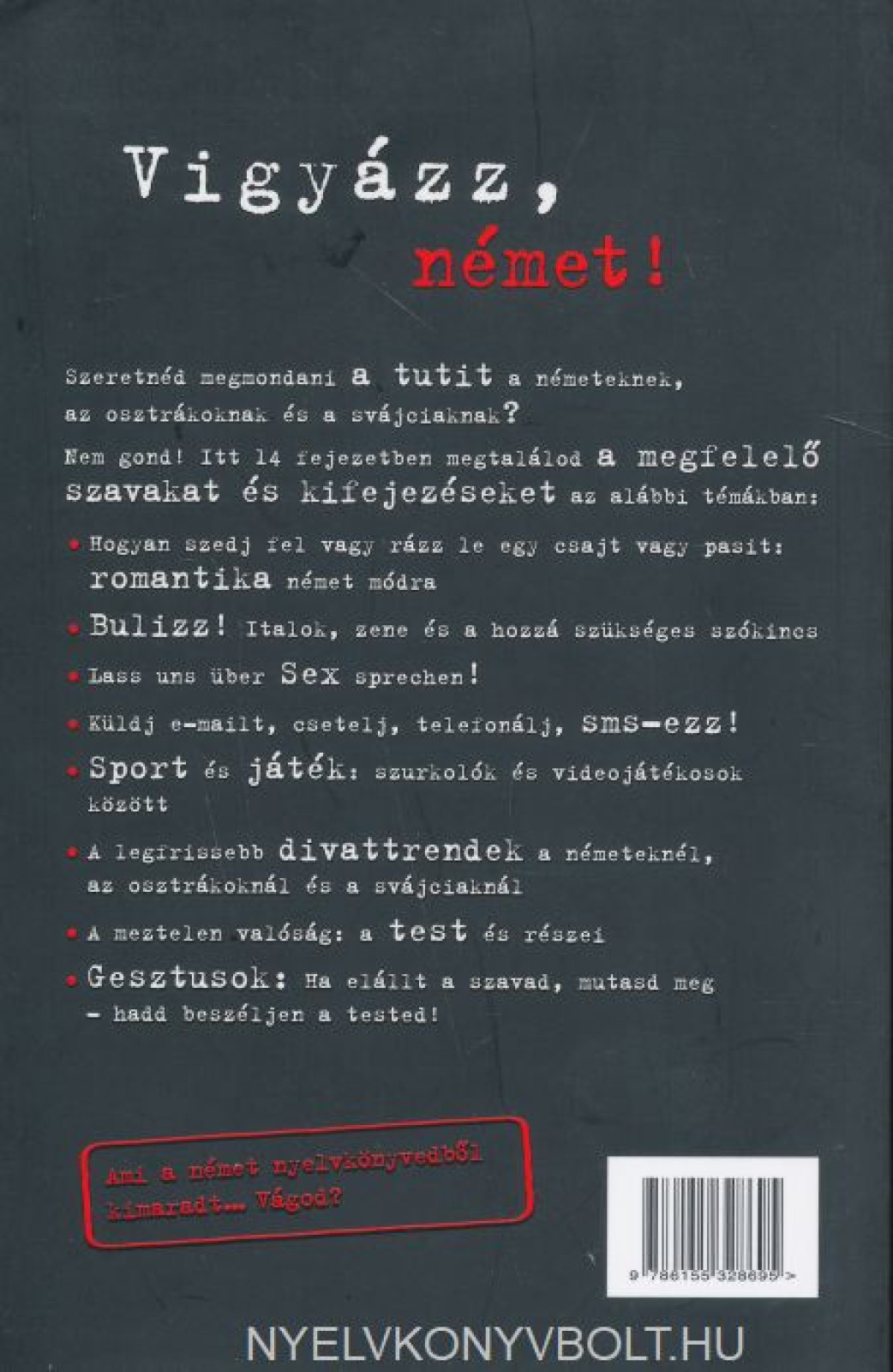 A "Vigyázz, német!" tartalmazza mindazt, amire szükséged lehet, bármit is akarj a németekkel megdumálni. Ebben a könyvben nincsenek nyelvtani szabályok, gyakorlatok. Vannak viszont olyan kifejezések, amelyeket tényleg használnak: legyen szó sportról, divatról, szexről, számítógépről, telefonálásról, sms-ezésről, vagyis a mindennapjaidról.