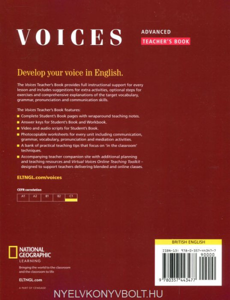 Carefully sequenced activities featuring real world content fully prepare learners for interaction and guide them to develop their voice in English. Voices is a seven-level, integrated-skills program for adults and young adults that enables instructors to teach with confidence in all classrooms. Supported by a common-sense lesson progression and a Virtual Voices Toolkit featuring professional development resources, teachers have the learning and teaching materials they need to deliver engaging courses both online and in person.