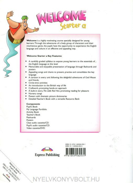 Pupils experience the world through the adventures of two mice, Cecil Mouse and Ellie May, along with the all-time-favourite Masid, the genie! Welcome Starter a comprises three modules of two units each. It focuses mainly on Listening and Speaking, but also offers pre-writing and pre-reading activities as well as a subtle introduction to the alphabet. Key Features: Presentation of vocabulary through colour flashcards & posters. Stickers. Total Physical Response activities. Circle-time activities. Module check at the end of each module. Full-colour Activity Book. Nursery songs and rhymes. Board games. Teacher's Book with additional activities and games. Fully dramatised audio CDs. Fully animated DVDs.