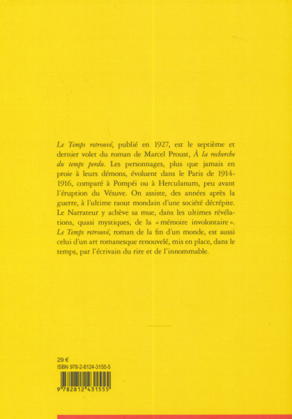 Le Temps retrouvé est le dernier volet du roman de Marcel Proust, A la recherche du temps perdu. Les personnages évoluent dans le Paris de 1914-1916. Le Narrateur y reçoit les ultimes révélations de la mémoire involontaire. Le Temps retrouvé, roman de la fin, et du début, d'un monde romanesque.