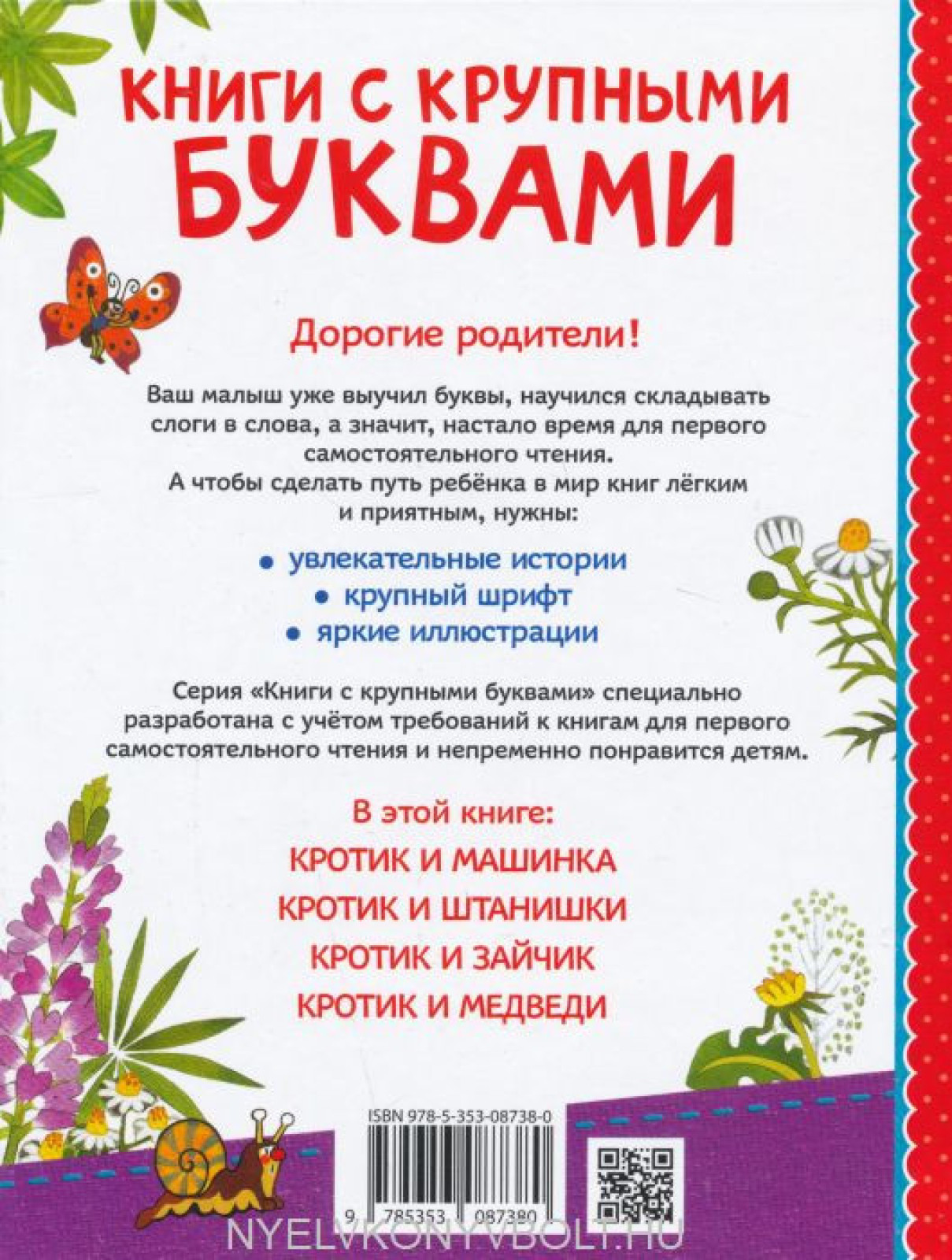 V sbornik voshli dobrye istorii o veselom Krotike i ego druzjakh, adaptirovannye dlja samostojatelnogo chtenija detmi doshkolnogo vozrasta: «Krotik i mashinka», «Krotik i shtanishki», «Krotik i Zajchik», «Krotik i Medvedi». Krupnyj shrift, jarkie illjustratsii, uvlekatelnye sjuzhety sdelajut chtenie legkim i prijatnym.